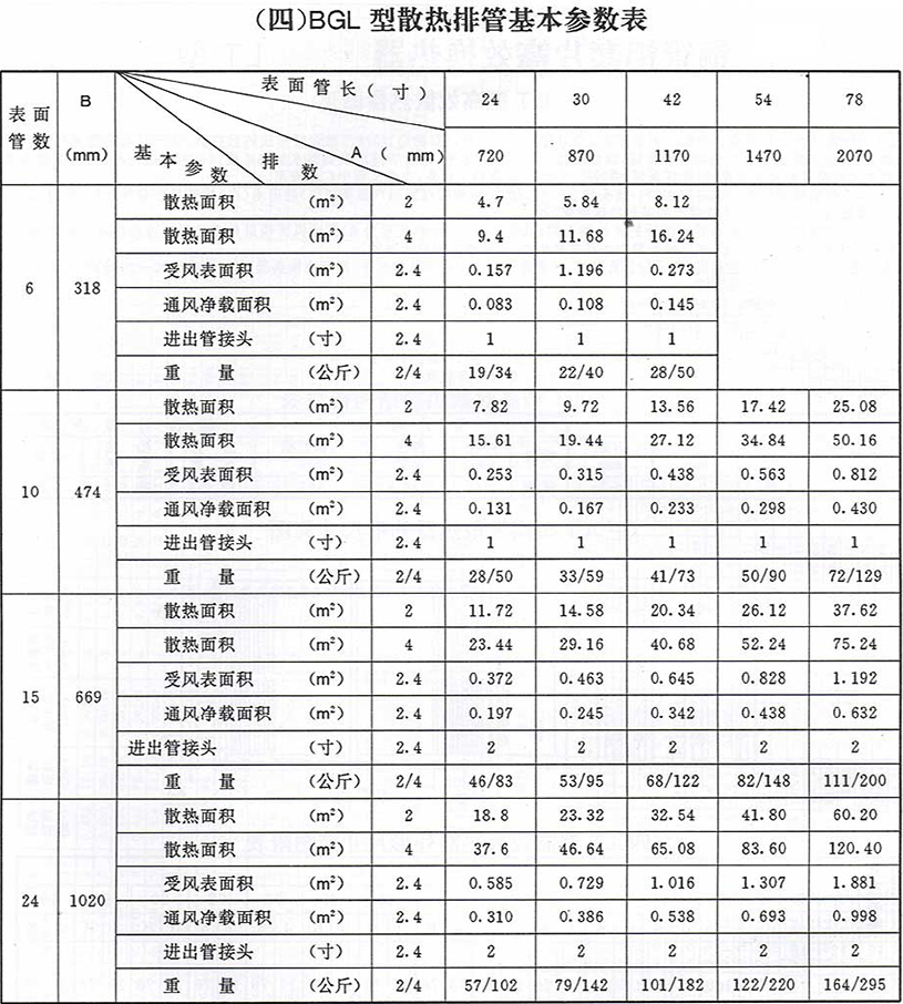 BGL型不鏽鋼散熱排管,可分二排、四排、六排,當然也能制單排,以及其他非标形式,每種型号均有大小不同的規格,在此隻标常規型号、規格。其中外殼、無縫不鏽鋼管¢18×2m/m均用1Cr18Ni9Ti材料,其翅片管用鋁軋制而成,翅片管外徑爲¢38mm,根徑爲¢19mm,其片高爲9.5mm,片距爲R片(3m/m),翅片管呈螺旋狀。