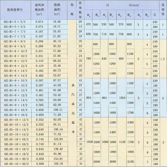 SZL(B)型翅片管散熱器,用無縫鋼管φ25×2.5mm作爲基管,鋁孔翅片管外徑爲直徑57mm,根徑爲φ26.5mm,片距爲2.8mm組成。散熱性能好、使用可靠、耐腐蝕性、光潔、美觀。廣泛應用于乳品、啤灑、食品、澱粉、化工、造紙、機械、醫藥、空調、印染等行業。